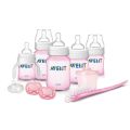 The handy collection SCD271/00 by Philips AVENT including 4 Classic feeding bottles (2x 4oz and 2x 9oz), a bottle and nipple brush, and a white translucent pacifier 0-6 months.
