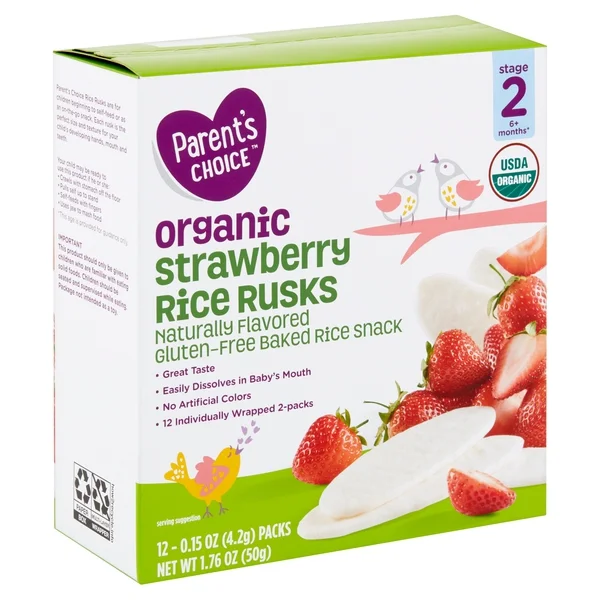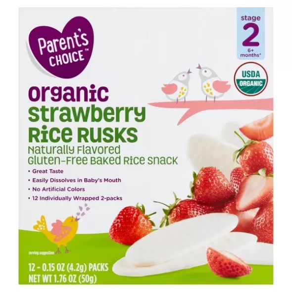 Details Ingredients Organic Rice Flour, Organic Sugar, Salt, Organic Strawberry Flavor, Organic Strawberry Powder Product features Parent's Choice Organic Strawberry Rice Rusks, Stage 2, 6+ Months, are a delicious, handy snack for children who are beginning to feed themselves and for when the family is on the move. The strawberry-flavored rusks, which contain no artificial colors, not only taste great but also will dissolve easily in your little one's mouth. These gluten-free organic snacks are designed to be the ideal size and texture for your child's developing hands, mouth, and teeth. They are formulated for children who are 6 months and older. Each package comes with 12 individually wrapped packs of 2 rusks each, giving you a supply of a satisfying treat for your child when you're at home or on the go. Parent's Choice Organic Strawberry Rice Rusks, Stage 2, 6+ Months, are a great snack option for children who are learning to feed themselves. Since 1998, Walmart's Parent's Choice has been trusted by parents across the country to provide quality, affordable baby products. We offer a wide range of products including diapers, wipes, toiletries, baby food, formula and baby feeding products. With a quality guarantee to back up all its baby, toddler, infant and newborn products, Parent's Choice takes care of your little one's needs for less. Stage 2 6+ months* *This age is provided for guidance only. Parent's Choice Rice Rusks are for children beginning to self-feed or as an on-the-go snack. Each rusk is the perfect size and texture for your child's developing hands, mouth and teeth. Your child may be ready to use this product if he or she: • Crawls with stomach off the floor • Pulls self up to stand • Self-feeds with fingers • Uses jaw to mash food Parent's Choice Organic Rice Rusks, Strawberry, Stage 2, 1.76 oz: 12 individually wrapped packs of 2 rusks each Gluten-free Made with organic rice No artificial colors Easily dissolves in infant's mouth Special Features Made with organic rice Net Quantity of Content 6 X 4 rusks (8g)