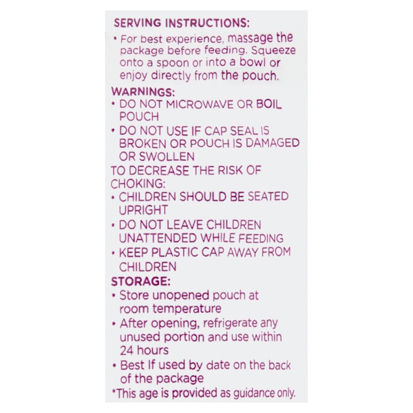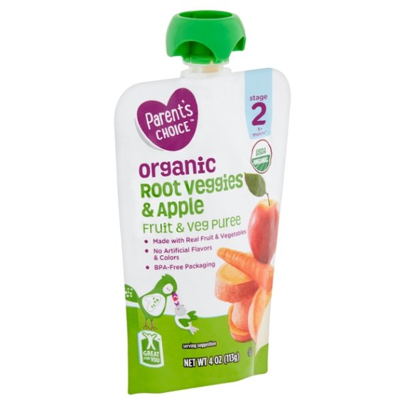 Details Ingredients Organic Carrot Puree, Organic Apple Puree, Organic Sweet Potato Puree, Organic Lemon Juice Concentrate Product features Stage 2 6+ months* *This age is provided as guidance only. As your infant grows into a toddler, feed him or her in an easy, healthy way with Parent's Choice Organic Root Veggies & Apple Fruit & Veg Puree, Stage 2, 6+ Months. This fruit and vegetable puree is ready to eat right from a convenient, squeezable package. The organic mix of carrot, apple, and sweet potato puree combined with lemon juice provides essential nutrition that travels well for a great snack on the go. This snack has no artificial colors or flavors added, and comes in a BPA-free pouch. The puree offers iron, calcium, and potassium, as well as 3 grams of dietary fiber per pouch to help with your child's digestion. Have a healthy, tasty snack on hand for your infant any time you need it with Parent's Choice Organic Root Veggies & Apple Fruit & Veg Puree, Stage 2, 6+ Months. Parent's Choice provides parents with baby and toddler products you need at a price that won't push your budget over the edge. We offer everything you need from bath time to bed time and every time in between, all with the high quality we know your little one needs. Parent's Choice is conveniently available online and in Walmart stores nationwide, allowing you to stock up, save money and live better. 4oz of puree per package Contains carrot, apple, and sweet potato puree Iron, calcium, and potassium included 3g dietary fiber per serving Refrigerate after opening and finish within 24 hours Special Features 3g dietary fiber per serving Net Quantity of Content 1 X 1 pouch (113g)