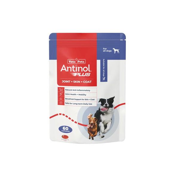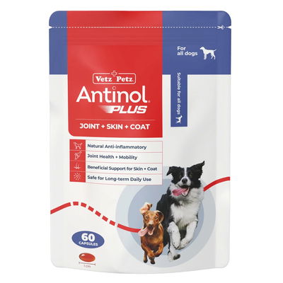 Antinol Plus is a natural joint, skin and coat supplement, made from a blend of patented marine sources. Specifically designed for dogs of all breeds, the treatment features the potent EAB-277 formula (New Zealand green-lipped mussel and phospholipid krill oil) with over 90 Omega-3 fatty acids that offer optimal benefits through synergistic efficacy and high bioavailability. The supplement also contains essential and rare fatty acids, nutrients and antioxidants to support joint health while enhancing the skin and coat condition. Regular use of these capsules on a long-term basis helps maintain the overall well-being of canines. It is free from harmful ingredients like synthetic preservatives and fillers.