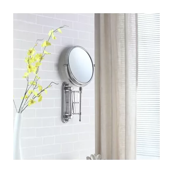 With a classic accordion extension, this magnifying wall mirror adds a vintage look to the Decor. Featuring a 3x magnification, this mirror tilts for easy viewing while doing hair and makeup. In a rich Silver Chrome finish, this wall mirror adds an instant update to the dressing area. This convenient wall mount mirror features a nickel finish for a clean, bright addition to your bathroom decor. This dual-sided magnification mirror has 3X magnification on one side while the other has standard magnification. A lovely two-sided accordion pull-out wall mirror that features 3x magnification on one side. Projects to 17" at full extension and 3" at full retraction. Wall Mount Design 7.25" Dia mirror Regular and 3X magnification Elegant Finish Complements Most Decorating Styles Extends 17" Use a damp cloth for cleaning and dry.