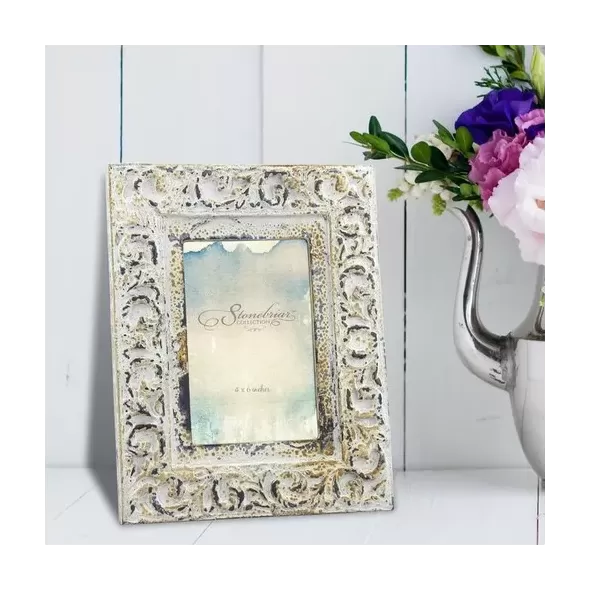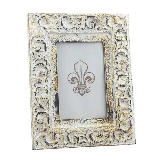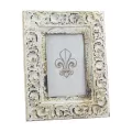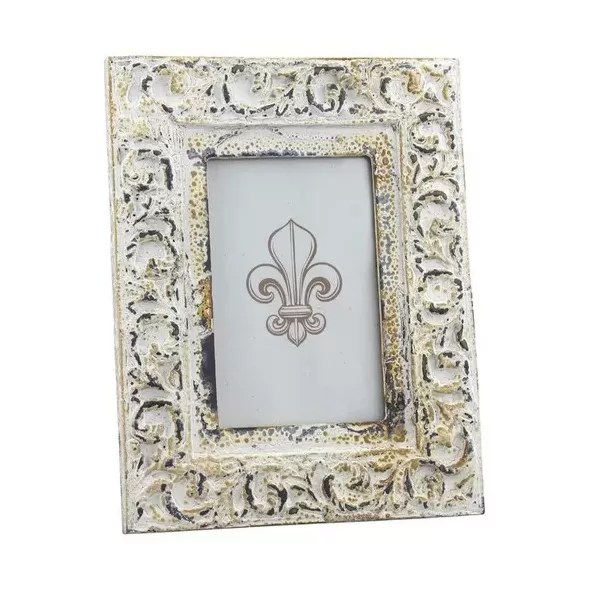 This 4 in. x 6 in. Vintage White Wood Frame is embellished with an aged Fleur d' Lis pattern and accented by an antique white finish. Echoes of Parisian architecture add a touch of romance while easily blending into any room. Part of our Parisian collection, which boasts elements of ranch architecture, symbology and antiques that mix with weathered metals and subtle hints of turquoise, pale ocean and amber to bring a touch of Paris into your home. Product ID 40780356