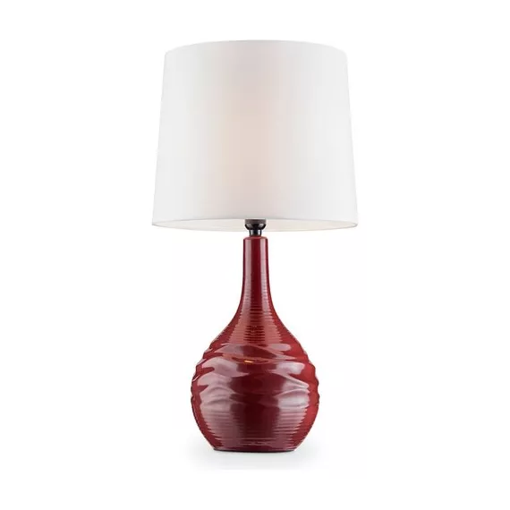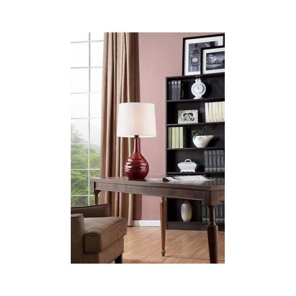 OK Lighting home decor and lighting combines elegant designs and functionality. The unique deep currant red table lamp features a white ivory drum shade and a shiny rippled base. Display it on a side table to create a modern and chic feel to the room. UL listed Number of Bulbs: 1 Bulb Type: E26 Bulbs Included? No Wattage: 60 Product ID 102352347