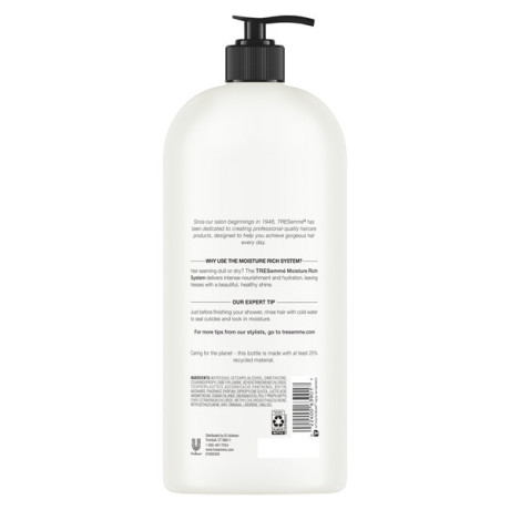 About This Item We aim to show you accurate product information. Manufacturers, suppliers and others provide what you see here, and we have not verified it. See our disclaimer Don’t let dry hair get in the way of a good day. Our TRESemme Moisture Rich Conditioner advanced moisturizing formula restores your hair’s vibrancy for a gorgeous look and radiant shine. Healthy-looking hair starts with getting the right amount of hydration. When your dry locks need some love, use our advanced moisturizing TRESemme Moisture Rich System for a hair-quenching boost of moisture. Enriched with Vitamin E, this professional-quality conditioner delivers optimized hydration that targets dryness and seals in moisture where your hair needs it most. Designed for daily use, our lightweight and professional-quality TRESemme Moisture Rich Conditioner, infused with Vitamin E, works with our moisturizing shampoo to revive dry and damaged tresses without weighing your hair down. That means hydrated, so soft hair with shine that makes you feel on point, every single day. Step 1: Start off your routine with TRESemme Moisture Rich Shampoo. Step 2: Apply an adequate amount from mid-shaft to ends, first, then work anything left through the roots. Step 3: Run a wide-tooth comb or fingers from roots to ends to detangle and fully coat hair. Leave on 2-3 minutes, rinse thoroughly. Step 3: Follow with TRESemme Moisture Rich hair conditioner for dry hair. Step 4: Finish up with your favorite TRESemme styling aids as needed. Our TRESemme Moisture Rich Conditioner helps restore vibrancy for healthy-looking hair with shine that’s ready to style. TRESemme Conditioner with Pump Moisture Rich 39 oz TRESemme conditioner for dry hair brilliantly revives dry and damaged hair by providing moisture to where your hair needs it most TRESemme moisturizing conditioner was designed to deliver optimized hydration to help restore vibrancy, while providing you with touchably soft, salon-healthy hair TRESemme Moisture Rich hair conditioner uses an advanced moisturizing system formulated with Vitamin E, and delivers a salon-healthy look and enviable shine TRESemme Moisture Rich hair conditioner for damaged hair is perfect for daily use and ideal for men and women with dry, damaged hair This hair conditioner for color treated hair offers professional, affordable salon-quality hair treatment for dry hair without the salon price tag Our dry hair conditioner works great when used in conjunction with our TRESemme Moisture Rich Shampoo and hair care products