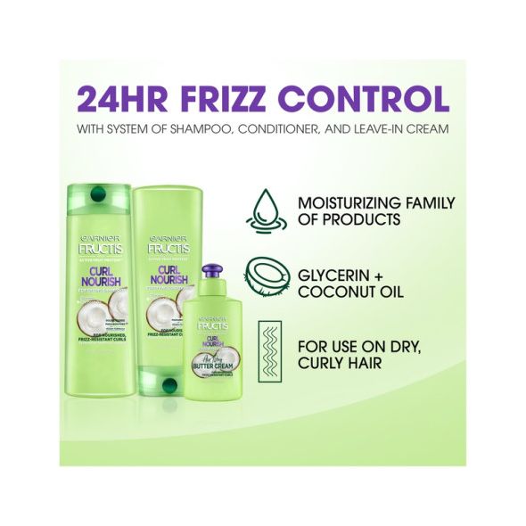 About This Item We aim to show you accurate product information. Manufacturers, suppliers and others provide what you see here, and we have not verified it. See our disclaimer Hair is almost entirely made up of protein, which gives hair its strength. ALL NEW, paraben-free Fructis formulas with Active Fruit Protein, an exclusive combination of citrus protein, Vitamins B3 & B6, fruit & plant-derived extracts and strengthening conditioners, are designed for healthier, stronger hair. The conditioner in our sulfate-free Fructis Triple Nutrition Curl Nourish system, with Coconut, Jojoba and Macadamia Oils, provides a gentle cleanse and intense nourishment for stronger hair with well defined, smoother, frizz-resistant curls. Garnier Fructis Curl Nourish Conditioner provides intense nourishment for curly hair Give your curls 24 Hour Frizz Control with the Garnier Fructis Curl Nourish System of products Infused with with Glyercin and Coconut Oil, no parabens Packaging may vary - new look, same amazing formula