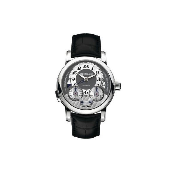 43 mm watch with stainless steel case, Montblanc Calibre MB R200, monopusher chronograph with automatic winding, anthracite-coloured dial with applique hour circle, date display, second time zone with day/night display, chronograph counters with rotating discs.